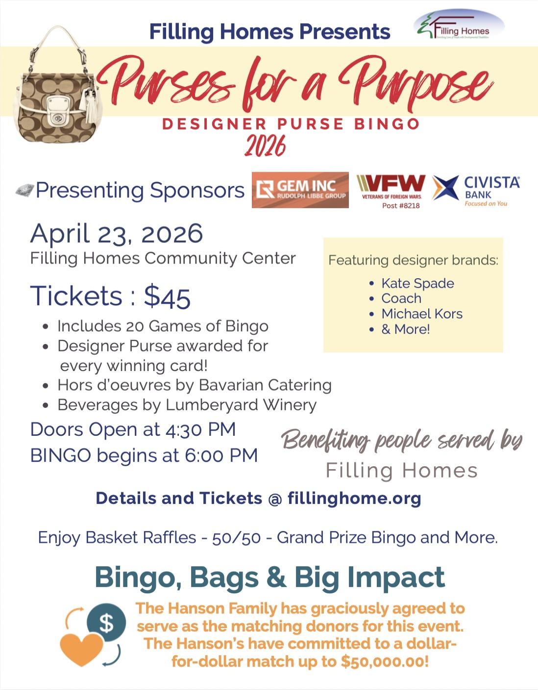 Filling Homes Designer Purse Bingo takes place at the Filling Homes Community Center located at 470 Independence Dr, Napoleon. This evening in Spring is planned so that men and women (but mostly women) can grab a dauber, a drink and as many bingo cards as can be watched for a chance to win one (or more) of 20 lovely, designer handbags! A baskets raffle, 50/50 drawings, food and beverages are all part of the fun.